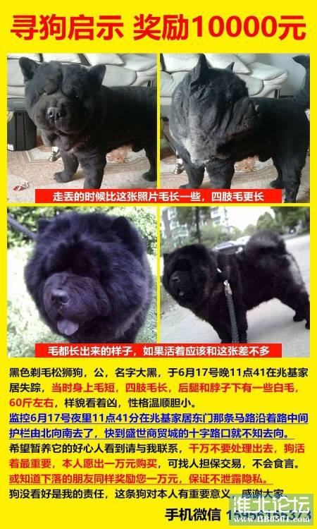 寻狗启示 黑色松狮狗 知道下落的朋友奖励您一万元 ...