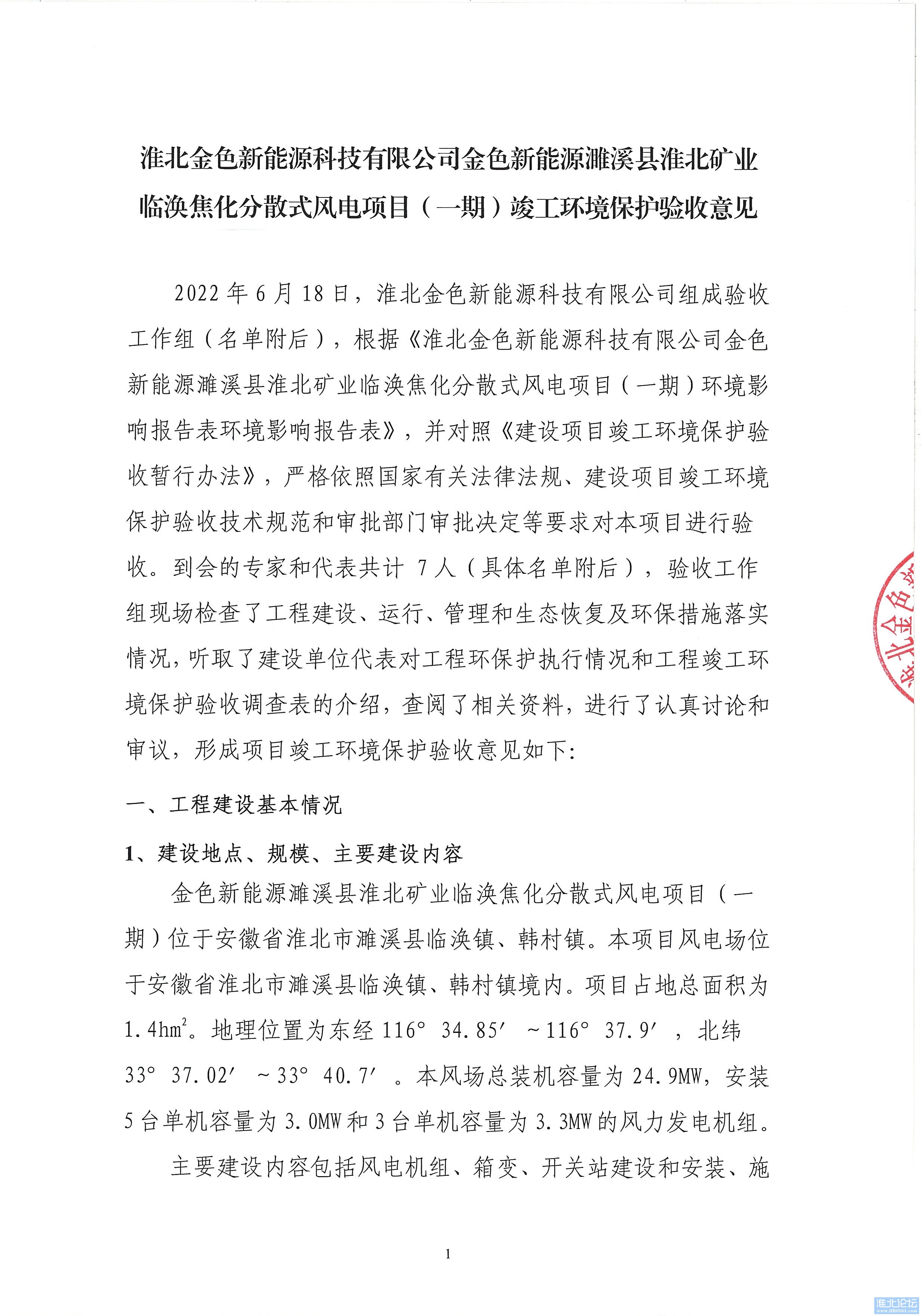 附件:淮北金色新能源科技有限公司金色新能源濉溪县淮北矿业临涣焦化分散式风电项目(一期)竣工环境保护验收意见
